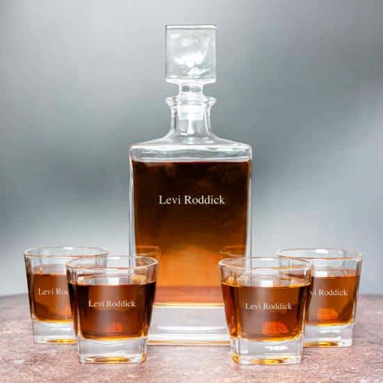 - Free personalization! Select one of our custom monogram designs. We’ll laser engrave your personalization on the decanter and lowball glasses for no extra cost.