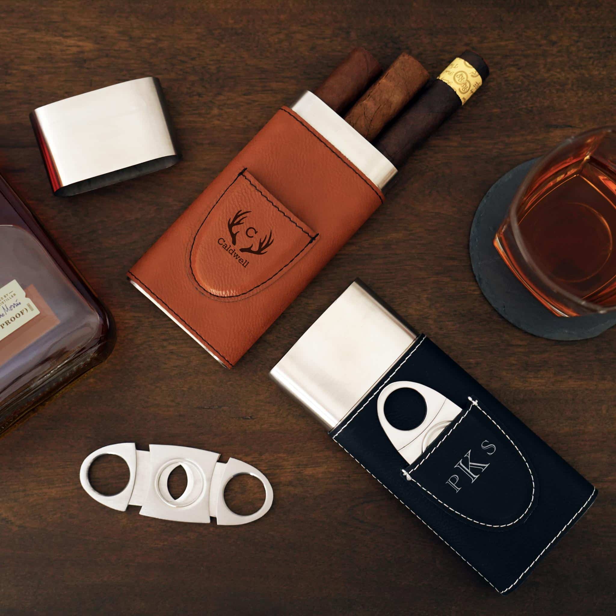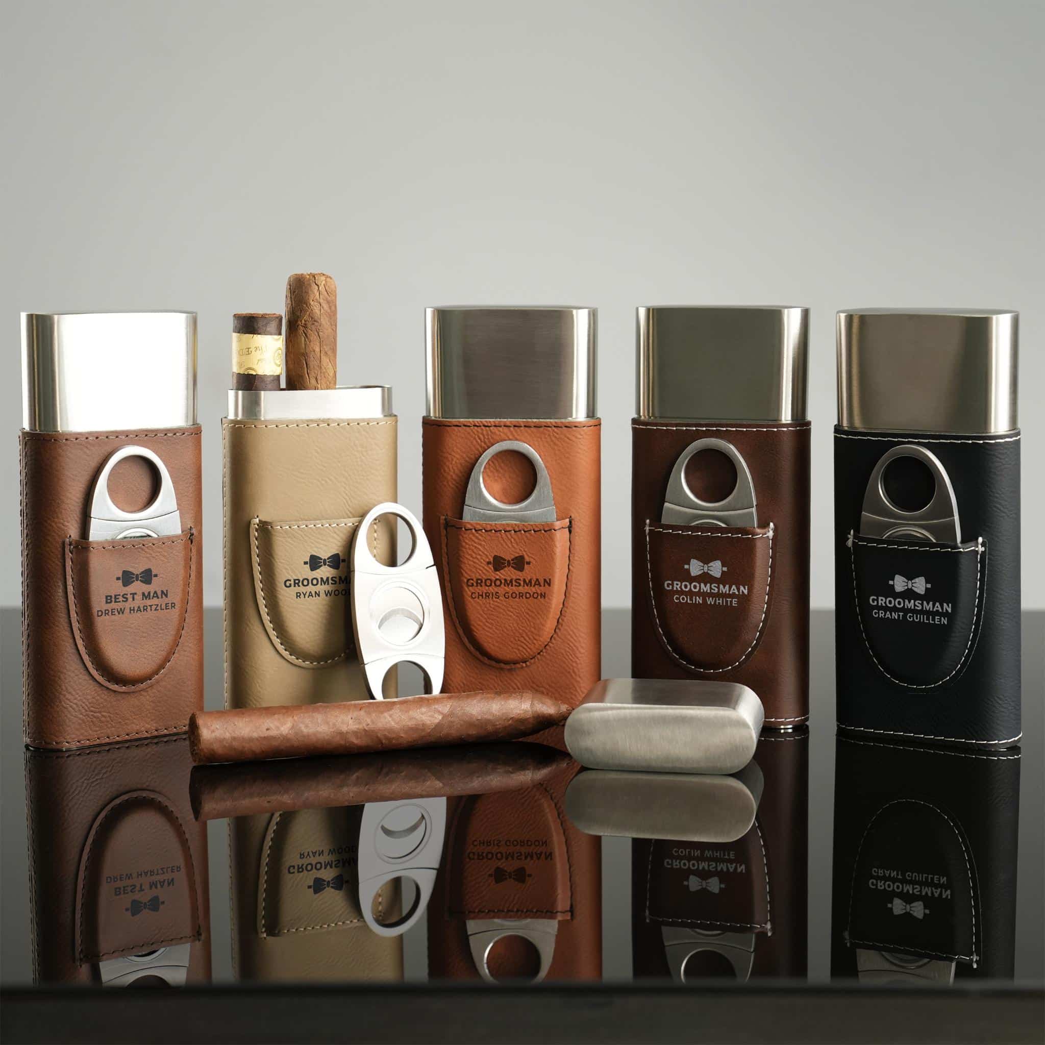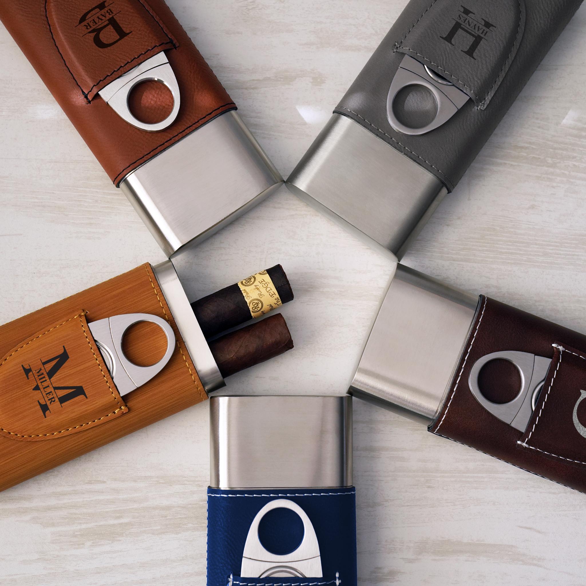 Our Personalized Leather Cigar Case with Cutter is a gift fit for the finest of groomsmen. It’s an essential accessory for cigar lovers to have on-the-go. It includes a leatherette-wrapped case that will hold two cigars along with a cutter that fits into the nifty front pouch.