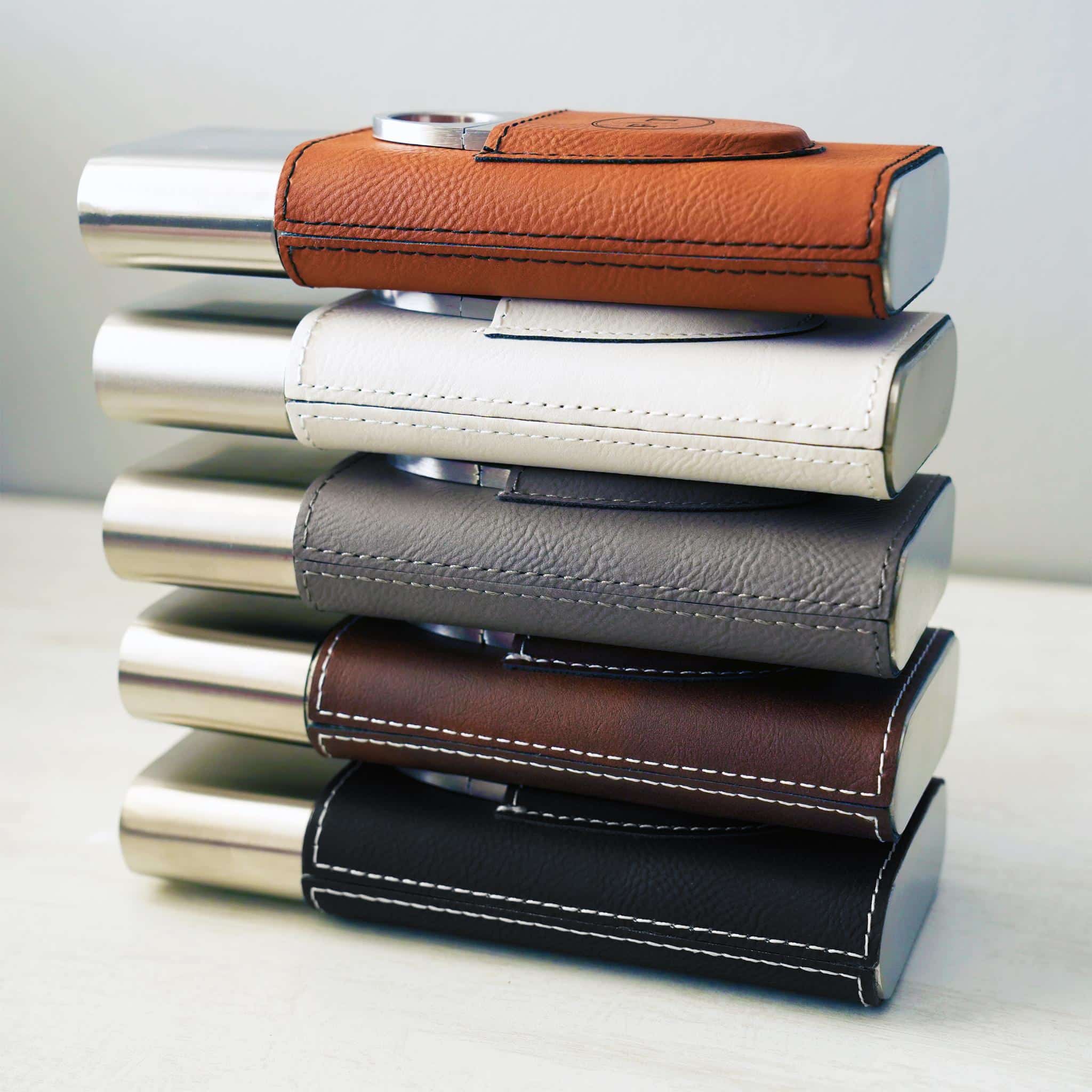 The cigar case is available in nine colors: rawhide, tan, brown (with black engraving), white, brown (with silver engraving), grey, bamboo and red. We’ll personalize by laser engraving your selected design for no extra cost.